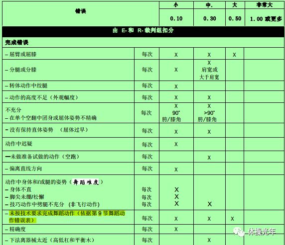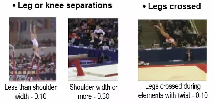 -分腿和分膝,窄于肩宽每次扣0.1,等同或宽于肩宽扣0.3;转体绞腿每次扣0.1。