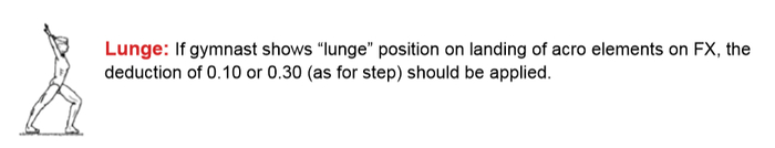 -关于落地扣分:轻微失去平衡扣0.1,落地时头在胯高度或几次轻微失去平衡扣0.3。多余步子,小跳扣0.1,大步或大跳(前脚跟和后脚尖距离超过1米)扣0.3。需要注意的是,落地要求完全站稳,任何步伐都会被扣分,自由操技巧动作采用弓步姿势(一脚在前一脚在后)落地,也被算作一步,看两脚距离扣0.1或0.3。舞蹈动作完成时失去平衡(身体没有保持垂线位置)也会扣失去平衡的分。