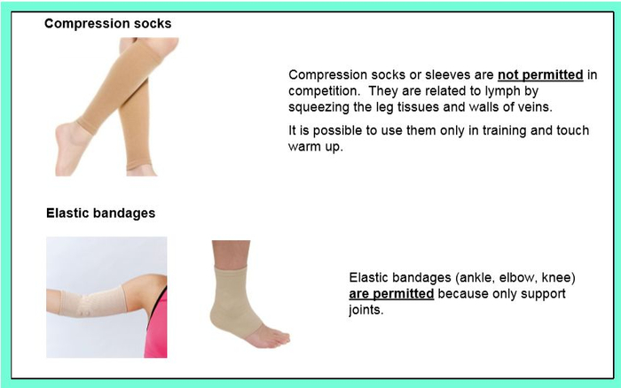 -压力袜或护腿比赛中不允许使用,但是用在脚踝、手肘、膝盖处的弹力绷带是可以的,因为只是用来保护关节。