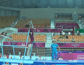 高低杠:选手落地后身体不受控制地向器械方向奔去,擦碰到了器械底部或手碰到了垫子(没有支撑):扣落地分,视情况加扣近杠的分;