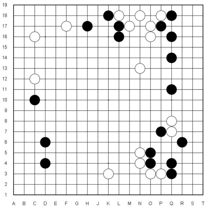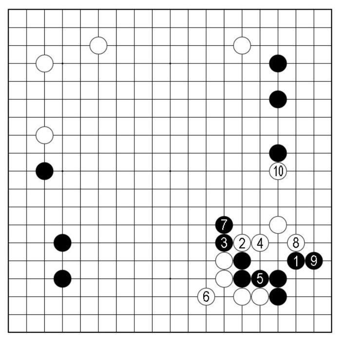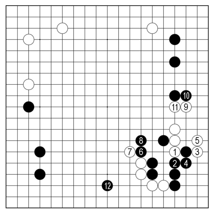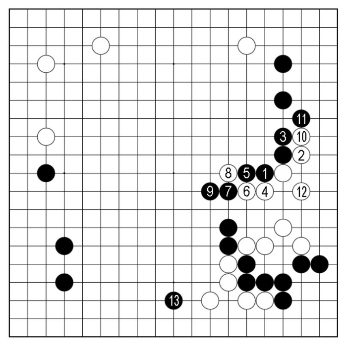 接下来黑1扳时,白2、白4连板紧凑,至白12虎整形成活,换黑取得外势,黑13抢先攻逼下方,亦成一战。
