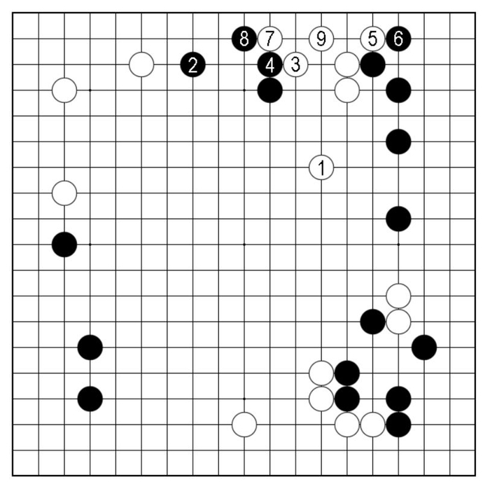 这一手是何用意呢?夹击白棋,却稍显宽松,白尚有拆的余地;加固右上,却似乎过于稳健。
