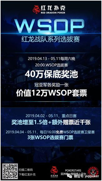 最近国内扑克圈,交流群和朋友圈也都是WSOP50周年的讨论,尤其是本次红龙扑克为众多普通玩家提供了免费参与WSOP这种国际大赛的机会,本届比赛WSOP中国军团参赛人数应该会有更高突破。第一场WSOP红龙战队选拔赛将于本周六晚20:00在红龙扑克举行,本场比赛保底40W,包含两张价值12W的WSOP50周年套票及浮动奖励,冠亚军各一张,你们准备好了?