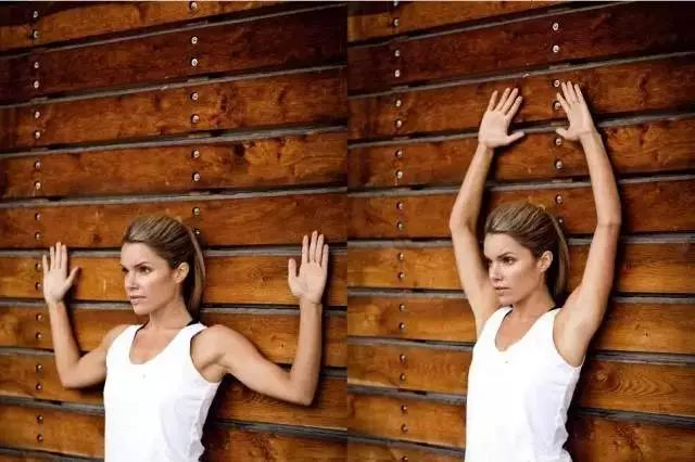 足跟、臀部和肩部贴着墙站立。保持下背部有一个较小的弧度,抬起双肘,使得双肘和双手在身体两侧展开贴着墙壁。摆好这个姿势后,将双臂向上伸直举过头,在整个过程中保持双手和双肘一直贴着墙壁。