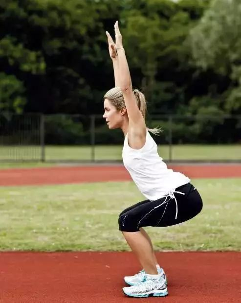 从站立姿势开始,膝盖分开与肩同宽,双手向上伸展举过头顶。保持手臂向上伸直,慢慢向下变成深蹲的姿势,就好像要坐在椅子上一样。
