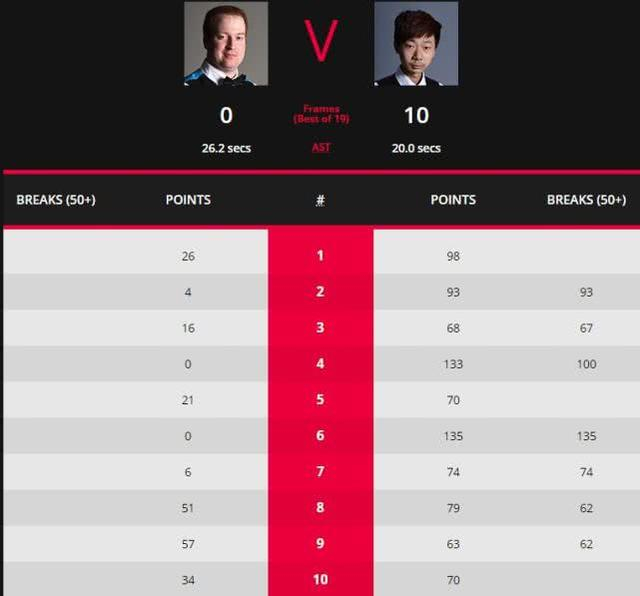 第一阶段结束之后,9-0这样巨大的优势,不仅体现在数字上,更让乔丹-布朗的内心被摧毁,第二阶段似乎只是履行手续而已。果然,第二阶段开始后,乔丹-布朗的状态依旧不佳,吕昊天以70-34拿下第十局,就此结束第二阶段的比赛。两个阶段结束后,他以10-0将乔丹-布朗横扫出局。