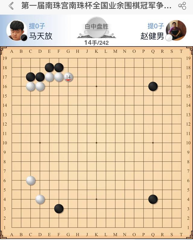 4月19日上午,2019首届南珠宫-南珠杯全国业余围棋冠军争霸赛决赛三番棋第二局在北海南珠宫酒店战罢。结果赵健男7段中盘击败马天放7段,2:0零封对手夺冠。赵健男由此从包括业余天王、全国数位业余冠军在内的32位顶级业余好手中脱颖而出,加冕业余棋界“王中王”。