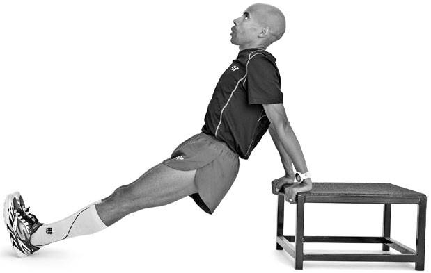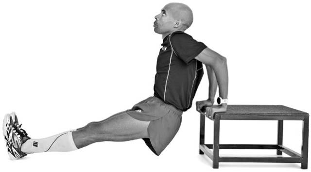 双手手掌放在身后大约0.6米高的长凳上。利用双手手掌和脚后跟后侧保持身体平衡,同时双腿在体前伸直。身体尽量下压,然后再恢复初始姿势。重复做10 ~ 20 次。
