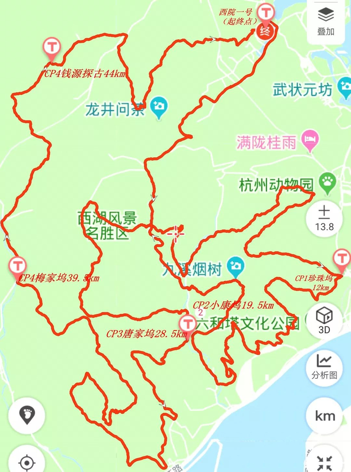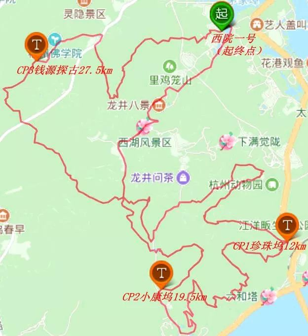 茅家埠西院一号(起点)—龙井路—龙井村—大人峰—象鼻峰—宏法坞—虎跑后山—贵人阁—虎跑水厂—珍珠坞(CP1计时打卡点:12km)—头龙头—月轮山—浙大之江校区—林泉山庄—九溪路—小康坞(CP2计时打卡点:19.5km)—大华山—八觉山—九溪烟树—九溪十八涧—寿星头—十里琅珰—天竺山—钱源探古(CP3计时打卡点:27.5km)—中天竺—杨梅弄—天马山—吉庆山—茅家埠西院一号(终点33km)
