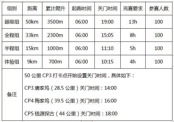 6. 超级组50公里从CP3打卡点开始设置关门时间,具体如下: