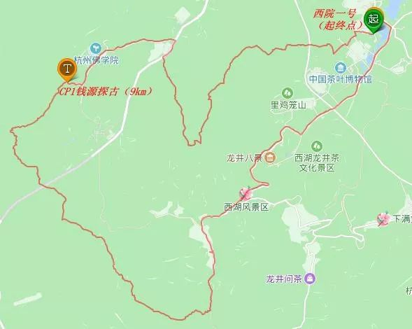 茅家埠西院一号(起点)—龙井路—龙井村—胡公庙(CP1计时打卡点4.5km)—十里琅珰—棋盘山—天马山—吉庆山—茅家埠西院一号(终点9.3km)