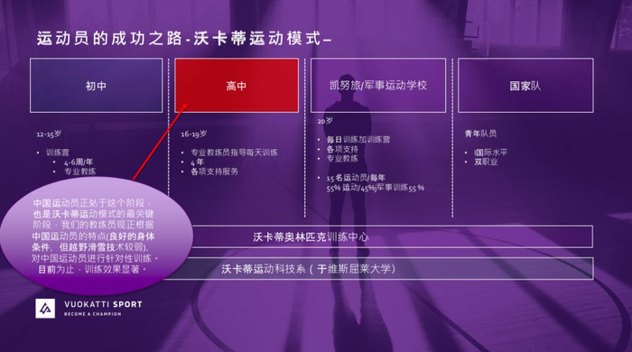在中国集训队所在的滑雪小镇沃卡蒂,中国越野滑雪队总教练格伦.林德霍尔姆就为中国媒体简述了沃卡蒂的运动员培养模型:12-15岁的青少年进入训练营,由专业教练指导,接受每年4-6周相关项目的训练;到了16-19岁的高中时期,被筛选后的学生在专业教练的指导下每天训练,持续整整四年;之后,部分学生会进入凯努旅军事运动学校,他们接受运动训练和军事训练内容的比例为11:9;而那些把运动作为职业一部分的青年队员,则会接受精英体育教育。所有的四个阶段,于韦斯屈莱大学、沃卡蒂运动科技系均会提供先进的科学支持。