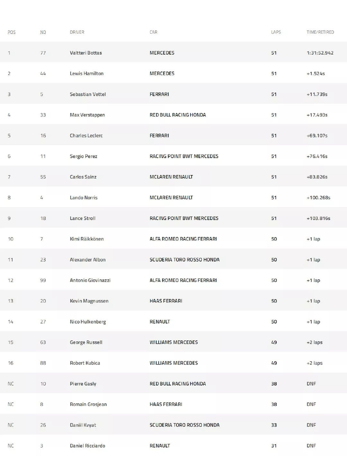 整场比赛51圈堪称平稳。于是,梅赛德斯和博塔斯也平稳地从杆位到冠军。再次感叹梅赛德斯的强大,也必须佩服现在汉密尔顿,是真的沉得住气。
