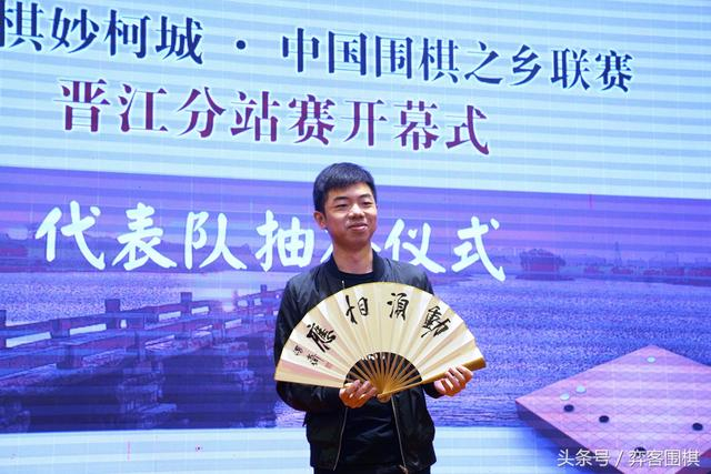 中国棋院围棋部副部长邵炜刚主持了晋江分站赛的抽签仪式。抽签所用道具为扇子,由中国书法家协会会员、晋江市书法家协会副主席许贻群题写围棋口诀于十二扇子上。