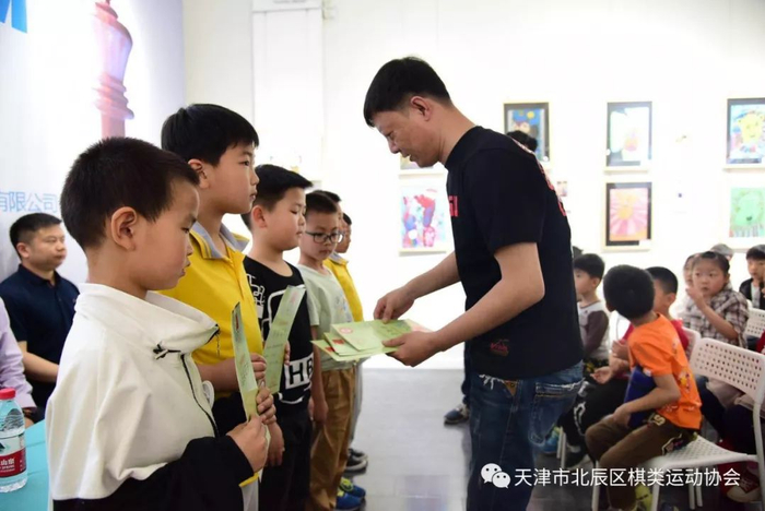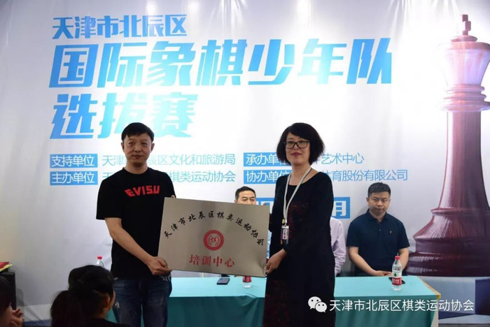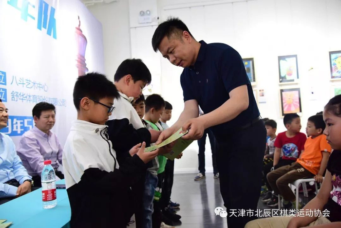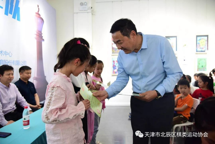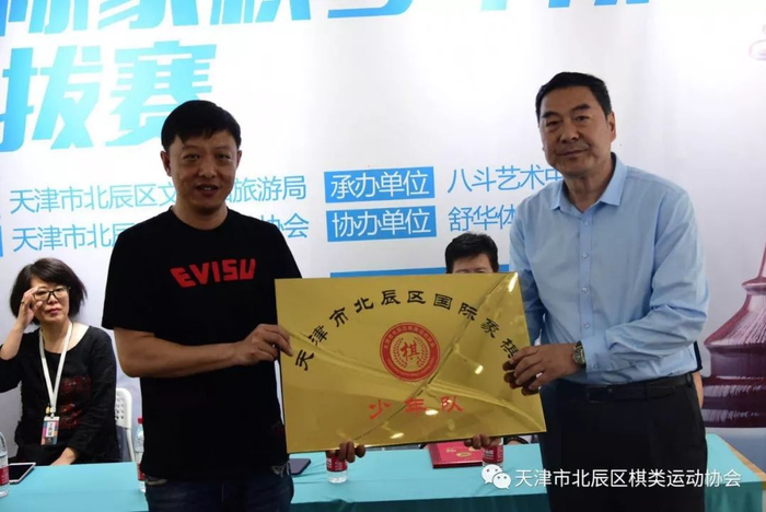 还由天津市北辰区文化和旅游局(体育局)调研员魏金春为谷利会长颁发天津市北辰区国际象棋少年队铜牌。