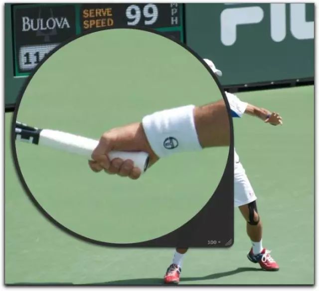 德约科维奇的正手引拍还有一个显著的特征——当球拍引至最远端时,球拍柄部底盖指向来球。这种手腕和手臂的位置关系,是职业选手正手技术的典型动作,也在他整个正手击球中担任最关键的角色。