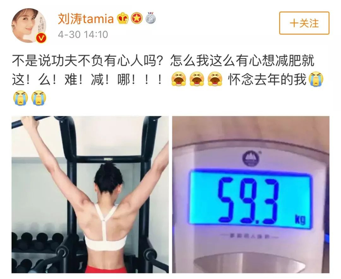 前几天,刘涛在微博坦然公开自己的体重,晒出体重机上显示59.3公斤的照片,马上逼近120斤了!对于娱乐圈的女明星来说,体重基本上都不过百的!