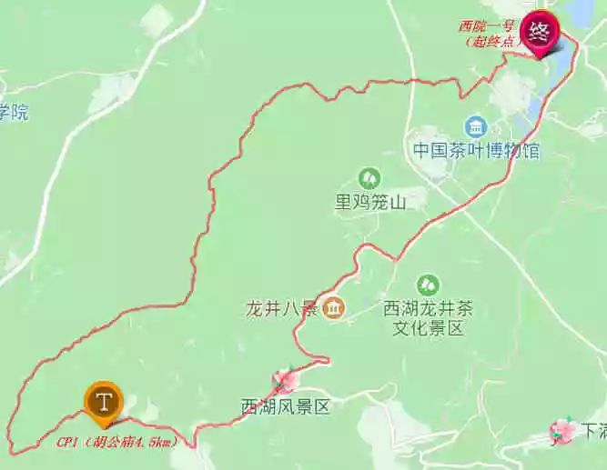 茅家埠西院一号(起点)—龙井路—龙井村—胡公庙(CP1计时打卡点4.5km)—十里琅珰—棋盘山—天马山—吉庆山—茅家埠西院一号(终点9.3km)