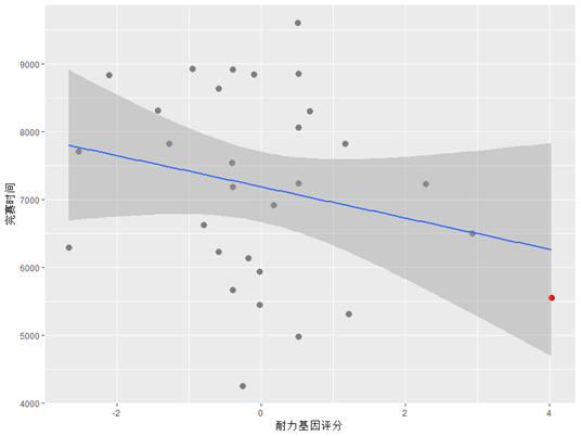 统计结果表明:先天耐力基因评分与完赛时间负相关,即耐力基因评分越高,完赛时间越短,跑速越快,成绩越好。