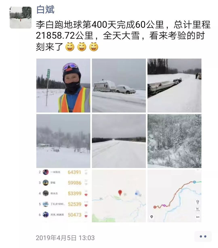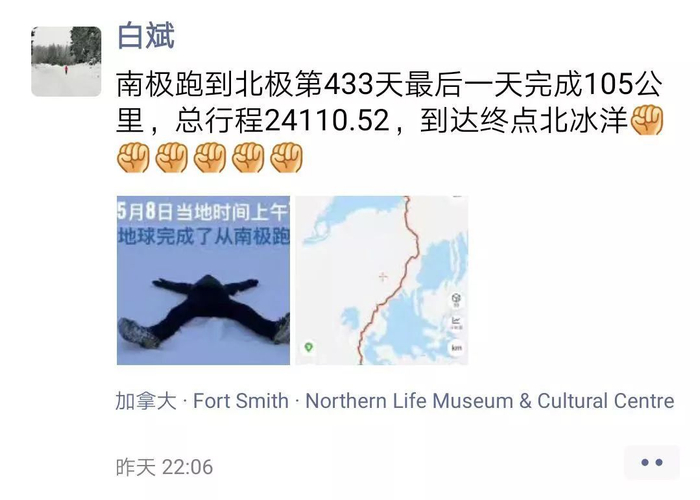 当地时间5月8日7:19,白斌完成了最后的103公里,为自己的“李白跑地球”壮举划上了圆满的句号,实现了从南极跑到北极的梦想!成为首位从南极跑到北极的中国人。