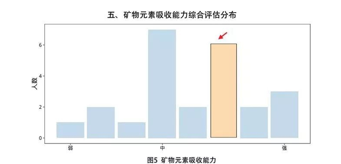 华大运动对各位跑者对于维生素VA、VB9、VC、VE等8种维生素以及镁、铁、磷3种矿物元素的吸收能力情况进行了综合的检测和评估(图4、图5所示),他对于维生素以及矿物元素的的吸收能力整体较高,这也为白斌顺利跑地球打好了基础。