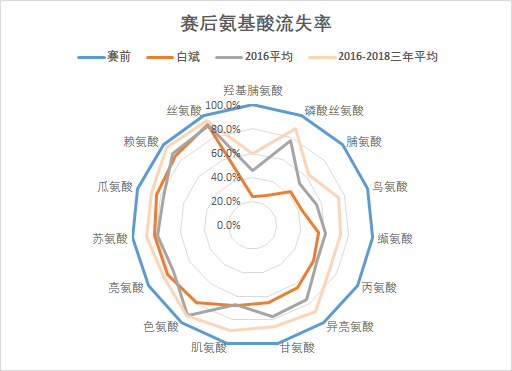 通过赛后氨基酸的流失率可以得知:白斌跑的很快,整体流失率高于平均水平,在流失的氨基酸种类中,主要是生糖氨基酸,包括支链氨基酸BCAA(亮氨酸、异亮氨酸和缬氨酸),丙氨酸,精氨酸,脯氨酸等。在跑步过程中需要及时补充身体流失的各种营养元素,避免因流失而导致的运动损伤。
