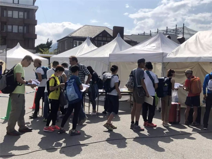 领物很流畅,提交健康和物品清单签名表,扫描二维码领取号码,领取参赛服,检查强制装备,全部完成后才给佩戴手环。有展会,强装没带齐的可以在展会上购买。官方纪念品商店需要排队,UTMF相关的物品一抢而空。