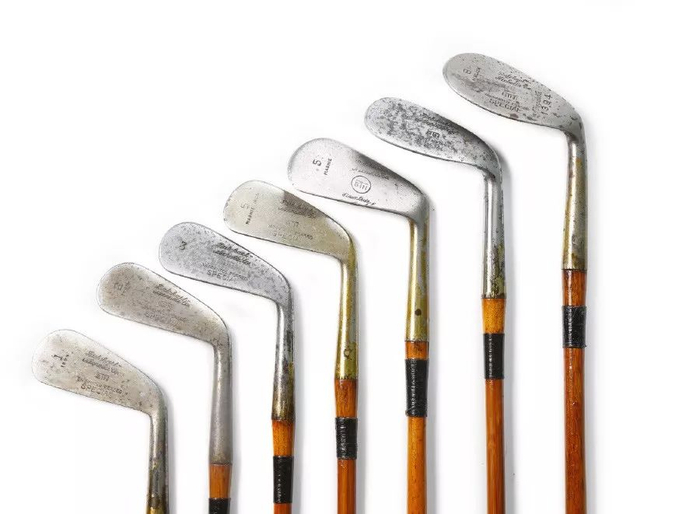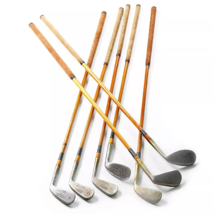 杆身的材质并非只有木头,竹子也是选择之一。竹子又称为藤条,杆身由长长的竹片层层叠加制成。本文介绍的是一套1920年代的球杆,由五支竹子杆身的1号、2号、3号长铁杆、5号中铁和10号铁(Mashie Niblic),以及两支核桃木杆身的Mashie Chip和切杆(Niblic)组成,每支杆头上都有着Butchart Nicholls的字样。Butchart Nicholls公司是由苏格兰人卡斯伯特·布查特(Cuthbert Butchart)与美国人吉尔伯特(Gilbert Nicholls)联合成立的、位于美国纽约州的一家高尔夫球具公司。