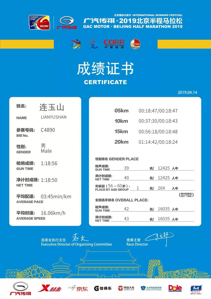 4月14日的北京半程马拉松,连玉山跑出了1小时18分50秒的成绩,不仅收获年龄组第一,还获得今年北马的直通名额。
