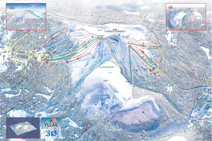 因为Ylläs雪道太多,而且3D地图信息非常详细,就不具体介绍雪道了,图中左边的山坡(东南坡)的雪道相对于右边的(西北坡)要长一些。
