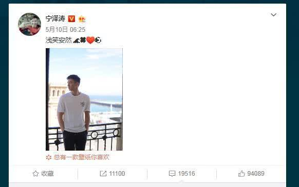 事实上,早在5月10日清晨6点多,宁泽涛就在个人微博里发了一张自己的靓照。照片中,站在阳台上侧脸看着什么?并配上“浅笑安然”四个字。同时,宁泽涛还用了“海草+草+爱心+鱼”的表情符号。