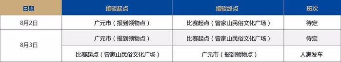 2、选手也可以预定广元市区报到处附近酒店,组委提供8月3号早上从市区到起点曾家山民俗文化广场接驳车(组委会后续公布接驳车班次)。