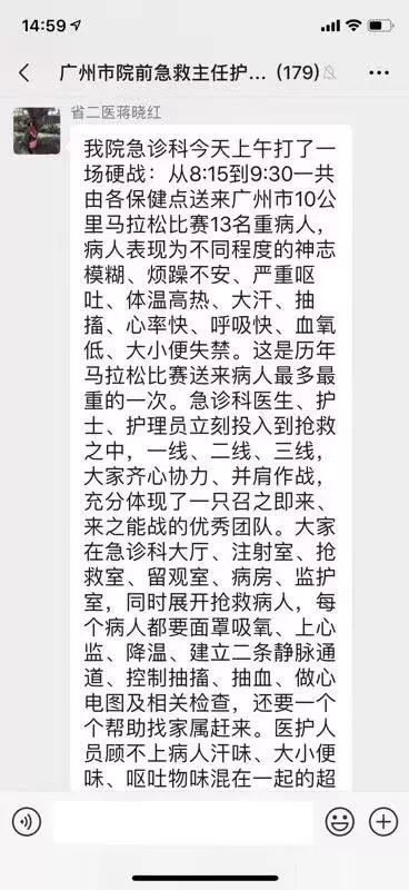 广州当地急救医生群中的讨论也印证了这场比赛的确导致跑者频频中暑。