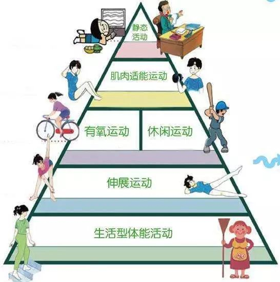 几年前,美国运动医学会曾推出一套“运动金字塔”理论,它将我们日常生活中的运动分为:生活形态的体能活动、伸展运动、有氧运动(休闲运动)、肌肉适能运动和静态活动这五类。它们分别占据了金字塔的五个层次。为大家提供了一套更科学、具体的运动指南。