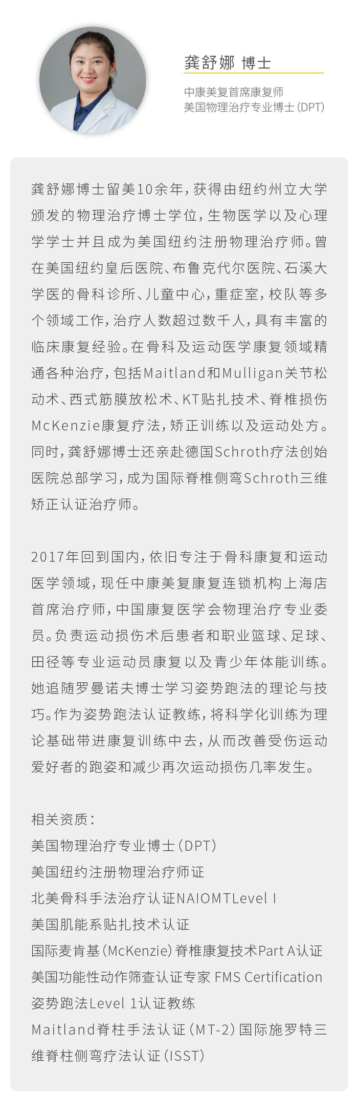 答:授课教练是龚舒娜博士。龚舒娜博士是中康美复运动诊所首席康复师,曾留美10余年,获得由纽约州立大学颁发的物理治疗博士学位,生物医学以及心理学学士并且成为美国纽约注册物理治疗师。曾在美国纽约皇后医院、布鲁克代尔医院、石溪大学医的骨科诊所、儿童中心,重症室,校队等多个领域工作,治疗人数超过数千人,具有丰富的临床康复经验。