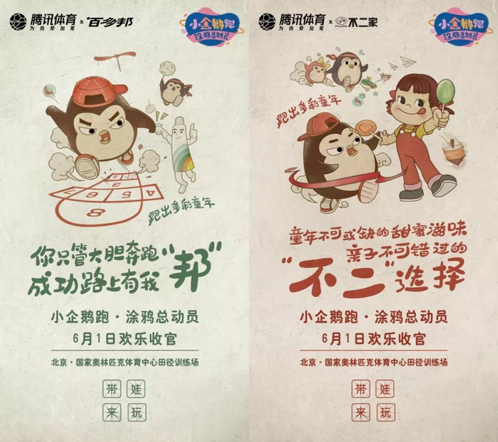 这首先体现在线上层面,腾讯体育以互联网思维来赋能品牌营销。例如,此前,腾讯联合品牌方共同发布了宣传海报,赛事特约赞助商百多邦与赛事的联合文案为“你只管大胆奔跑,成功路上有我邦”,赛事官方合作伙伴不二家与赛事的联合文案为“童年不可或缺的甜蜜滋味,亲子不可错过的不二选择”,通过文字游戏充分将品牌信息与赛事结合,体现了赛事想要突出“高质量陪伴”的初衷。而两张海报都是在充满童趣的风格下融入了品牌标识,提升了用户的接纳程度,在用户心中建立了优质的品牌形象。