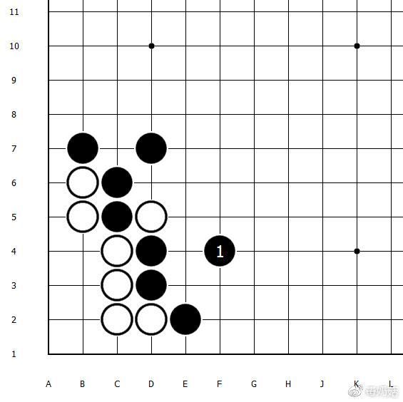 黑棋如果跳一个,白棋就可以脱先了。未来有E3的断吃,白棋目数比上图好很多,所以完全不需要立即战斗。