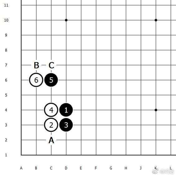 这是点三三变化的基本型,所有的变化都从这里开始。黑5只有三种应法:A位扳,B位飞,C位长。其他的选择,亏损20%起步。