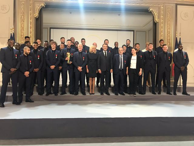 欧洲五大联赛落幕后,法国总统,42岁的马克龙和65岁的夫人布丽吉特,就再次在爱丽舍宫前,接见了法国全队。并给他们颁发了奖章。这已经是连续不到一年内,法国总统和夫人,接见世界杯冠军球队!