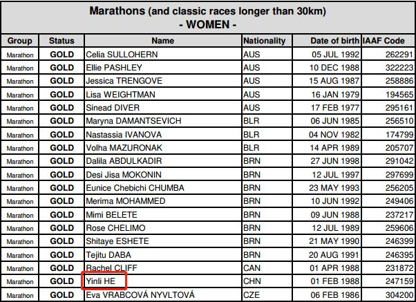 近日,国际田联在官网上更新了马拉松精英运动员名单,该名单根据选手在2018年12月4日至2019年4月15日期间的世界排名,将选手划分为金、银、铜三个等级。