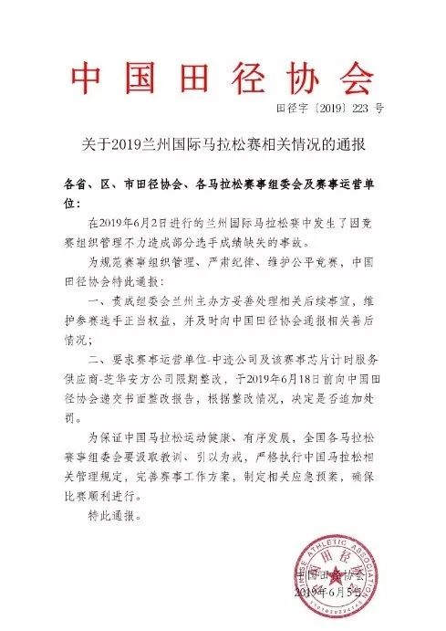 •中国田径协会关于2019兰马相关情况发布通报
