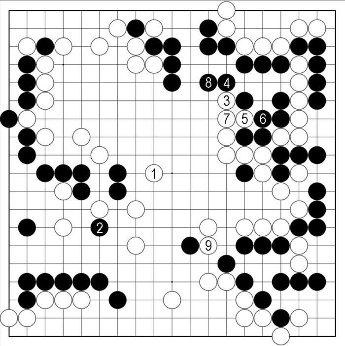白9割断一子,虽然都是正常的进行,但在逐步缩小的盘面,白棋的机会也渐行渐远了。