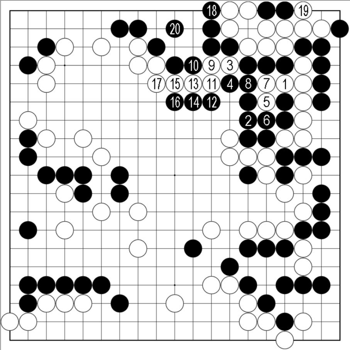 接下来,白棋有从白1位动出的手段,其中白3断完再5位打为好手顺,至黑20为止虽白棋先手拉回一队子力(其中黑18与白19的交换或可保留),但黑棋目数依旧遥遥领先。