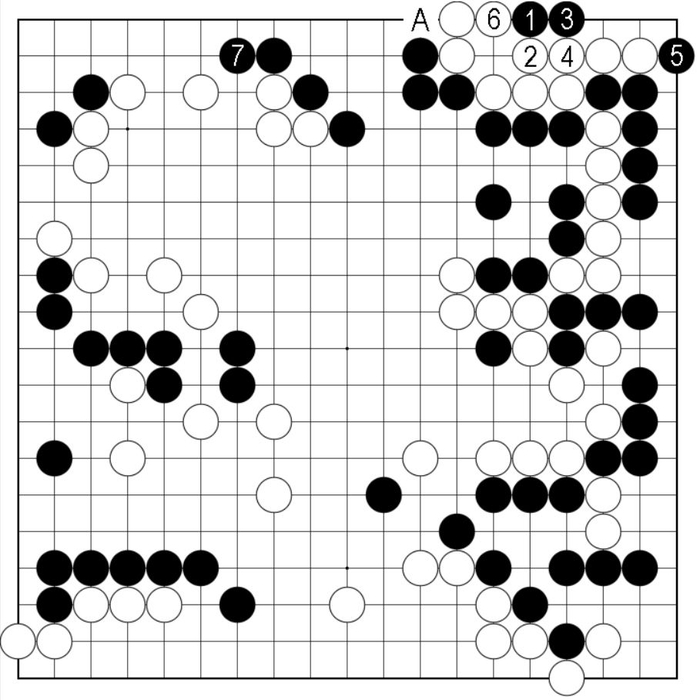 接下来,黑不仅得到黑5扳的先手官子,而且使A为变为先手,黑7再从二路长入,获益不可谓不多。