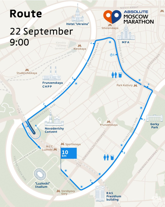比赛的起终点均位于俄罗斯最大体育场卢日尼基体育场,这里曾举办1980年的夏季奥运会。沿途选手们可以看到包括克里姆林宫,基督救世主大教堂,莫斯科市民大剧院,七座姊妹摩天大楼等30多个知名景点。