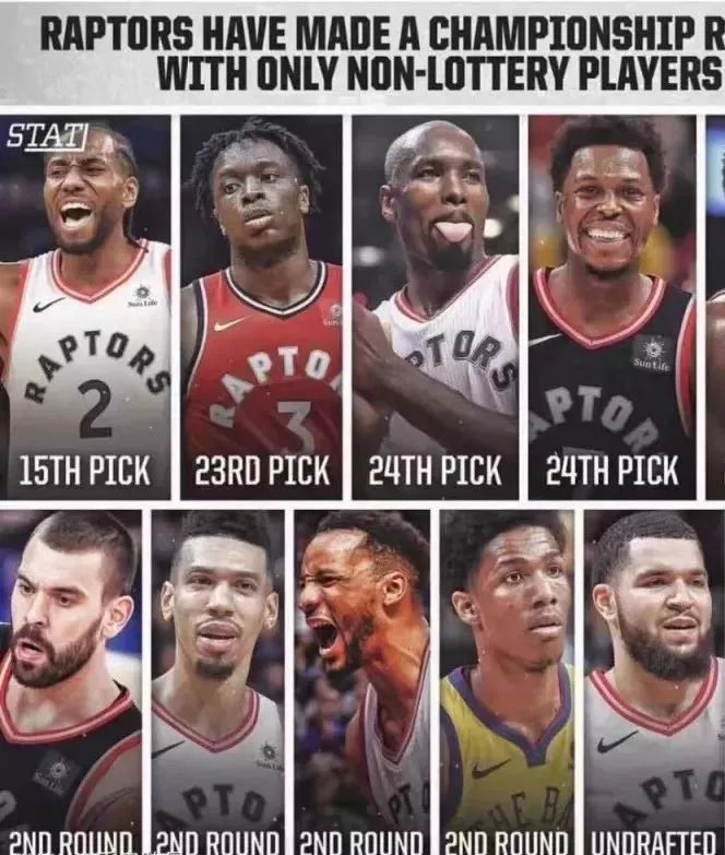 在NBA当前动辄就三巨头甚至五星战舰的当下,猛龙是继2011年小牛队之后的单核冠军队无疑是公认的事实,说这类单核球队是全民皆兵的打法也算有目共睹,但说猛龙账面天赋不足恐怕很多人难以认可。不过,在很大程度上,NBA选秀顺位往往是衡量一名球员绝对身体天赋的最直观指标,而猛龙则是NBA自施行选秀制度以来第一支没有乐透选秀球员的冠军球队,即使是放大到总决赛参赛队伍这一范围,猛龙仍是历史独一份。