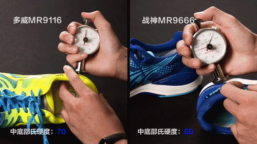 从测试可以明显的看出,战神的中底更柔软了。事实上,经过无数次的测验,DWMTE比普通的EVA缓震效能提升了30%。中底硬度更是比MR9116降低了15度。