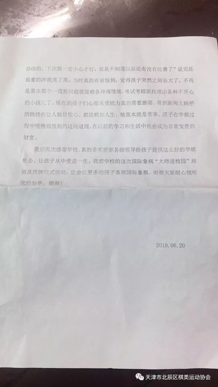 天津市北辰区棋类运动协会为提高北辰区青少年的国际象棋水平,特意在今年组织的国际象棋大师进校园活动收到诸多好评。今后还将该系列赛事继续做好,真正为北辰区国际象棋的发展做出贡献。