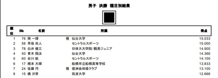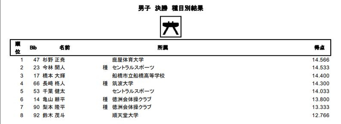 自由操,仙台大学的南一辉以15.033(6.4+8.633)获得冠军,白井虽然拿出6.8成套,但完成稍欠,除了绞腿问题外,更只有一串钉住,最终以14.9(6.8+8.1)收获铜牌。
