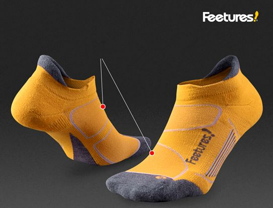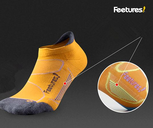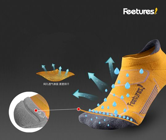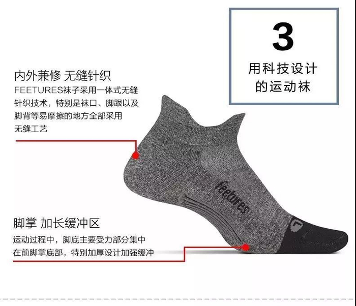 FEETURES: 由于重力缘故,跑步的时候,脚部汗水会一直呈下移状态,汇集到脚趾,这个时候就容易产生水泡,Feetures设计了一个巧妙的工艺,在脚趾部分做了一个安全线,既能减少摩擦,同时又能降低汗水下移脚趾的速度,将更多汗水留在大面积脚面,再结合面料的优越,使之迅速挥发!